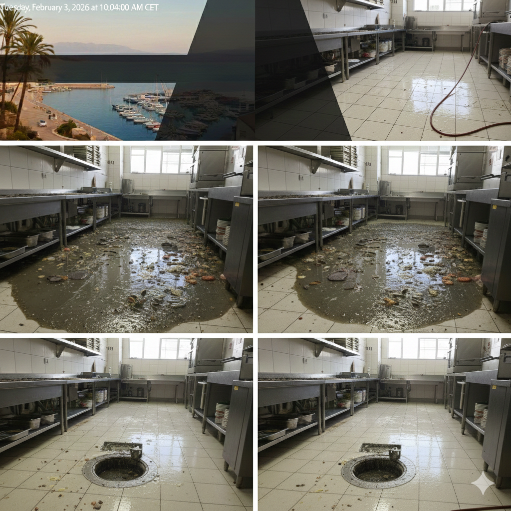 Une pizzeria du port de Sanary nous a contactés en urgence : les siphons de sol et de la plonge refoulaient, rendant toute activité en cuisine impossible. En moins de deux heures, le problème a été identifié, traité et résolu — sans produit chimique, sans casse, sans interruption prolongée.
